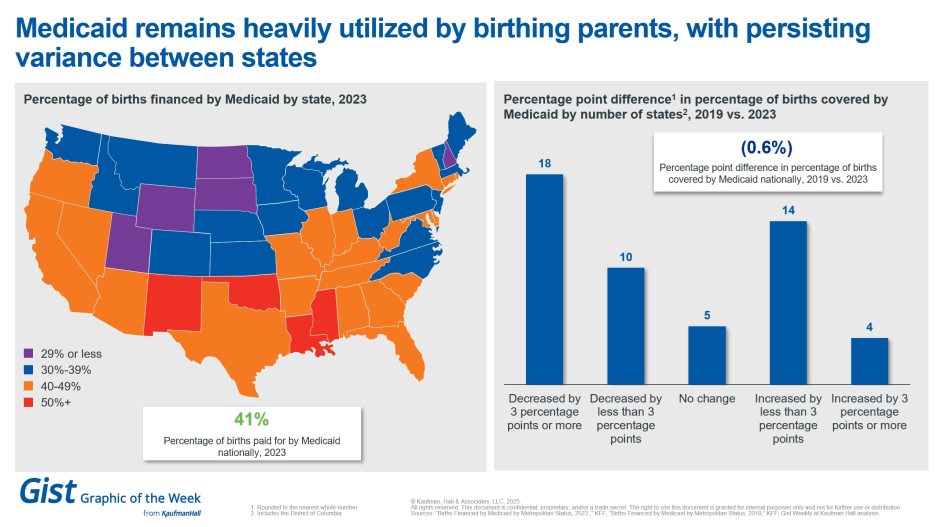 In light of Medicaid cuts in the now-signed OBBB becoming law, this week’s graphic highlights a prominent use of Medicaid. Even though only about 1 in 5 people are covered by Medicaid, in 2023, more than 4 in 10 births in the United States were covered by Medicaid. There is significant variation among states; nearly two-thirds of births in Louisiana were covered by Medicaid while only 21% of births in New Hampshire were. Notably, only Utah was below the national Medicaid coverage rate at 18% of births. While the national Medicaid birthrate has been steady since 2019, there has been measurable change on a state-by-state basis. Eighteen states saw a 3-percentage point decrease in the Medicaid birth rate over this time while 4 saw the opposite. Only 5 saw no change between 2019 and 2023. While increasing the birth rate remains a priority for President Trump, a changing coverage environment could become a new factor for some couples to weigh.