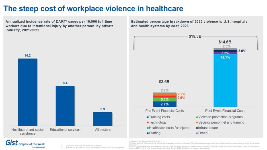 This week’s graphic features data from an American Hospital Association (AHA) report about violence in the healthcare workplace. As measured by days away from work, job restriction or transfer due to intentional injury caused by another person, the workplace violence rate in healthcare was nearly 5 times as high as the general rate in all sectors in 2021—2022. And it’s costly; in 2023 hospitals and health systems spent approximately $14.6 billion after violent events, nearly three-quarters of which went to direct costs to treat injuries. The AHA report highlights the magnitude of violence as a public health problem; its authors hope to inform policy and research efforts to address violence impacting U.S. hospitals and the healthcare system.